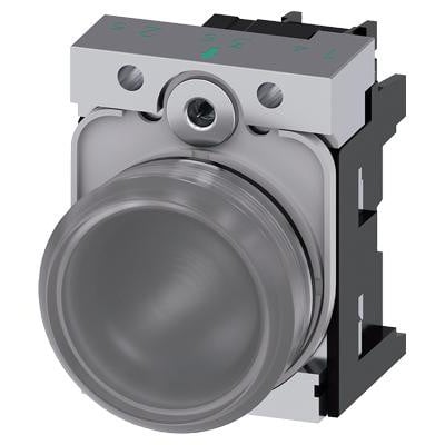 22 mm indikatorlampe med klar linse, glat overflade, holder, LED modul og integreret LED. Tilsluttes 110 V AC via skrueklemmer.