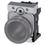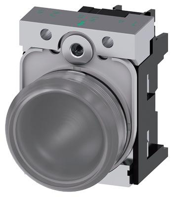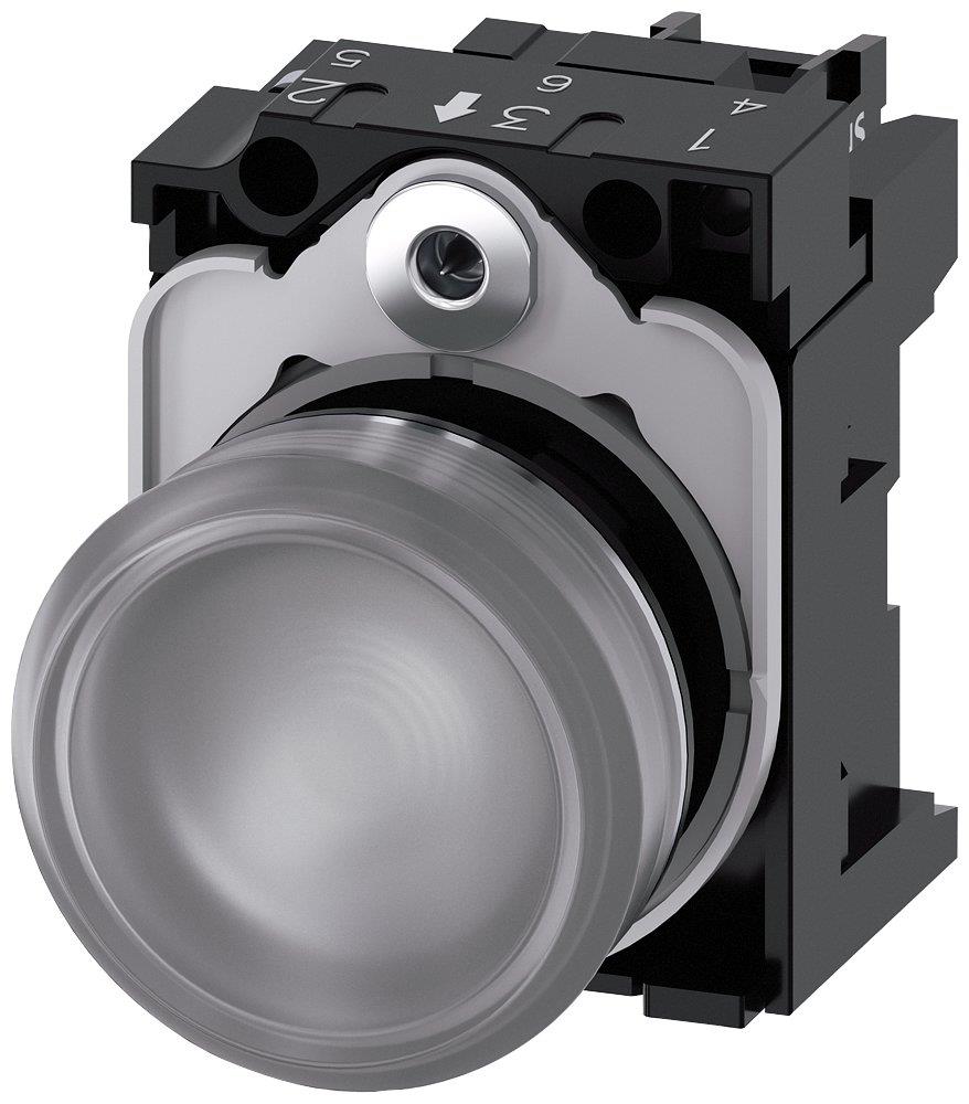 22 mm signallampe fra Siemens' SIRIUS ACT-serie. Rund model i metal med højglans finish og klar linse. LED-modul med integreret LED til 230V AC.