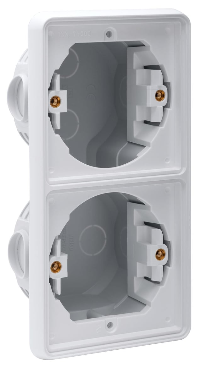 2-modul indmuringsdåse til lodret montering. Stænktæt indbygning med IP55. Slagfast og gennemfarvet. Fås i grå, hvid eller sort.