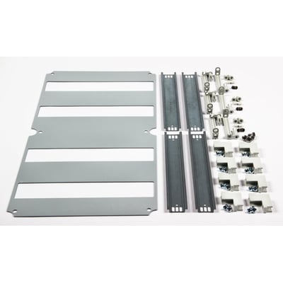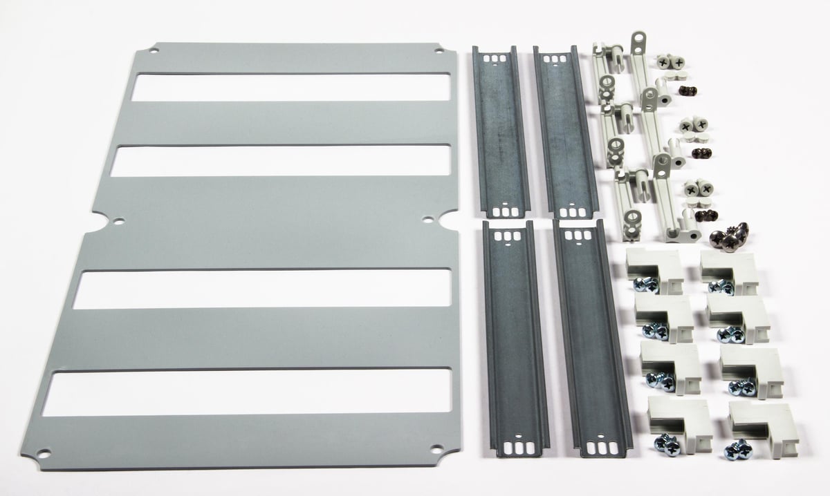 FIBOX EK Solid DIN-indsats leveres komplet inkl. afstandsstykker, DIN-skinner og dækplade.