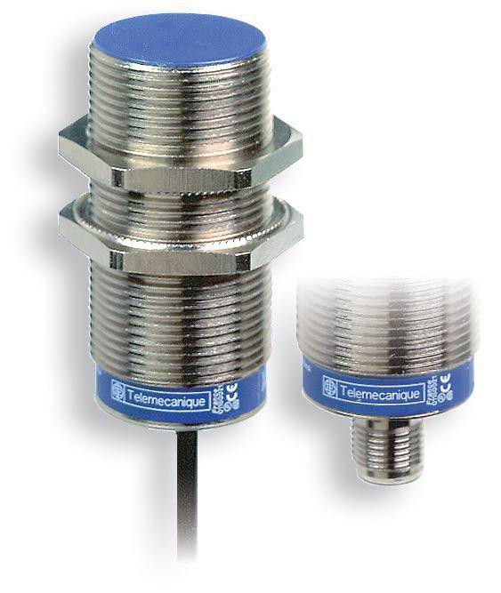 Denne induktive sensor fra XS6-serien er designet til pålidelig objektdetektering i industrielle applikationer. Sensoren er udført i robust metal og er skærmet for at minimere interferens.