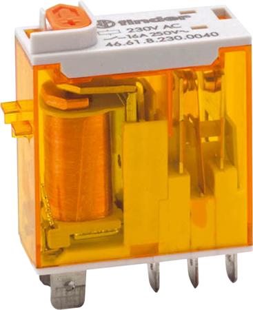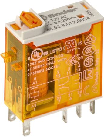 Industrirelæ 8A, 2CO, 12VAC med mekanisk indikator, låsbar testknap og LED. Til sokkel serie 97 eller lodning.