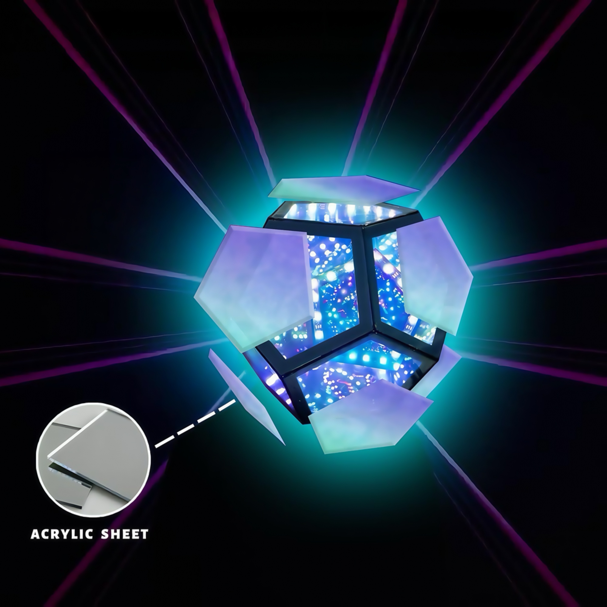 Dette infinity mirror light er designet til at tilføre en moderne og stemningsfuld belysning til ethvert rum. Med muligheden for RGBW-farver kan du nemt skifte mellem et bredt spektrum af farver og hvidtoner for at matche din indretning eller skabe den ønskede atmosfære.