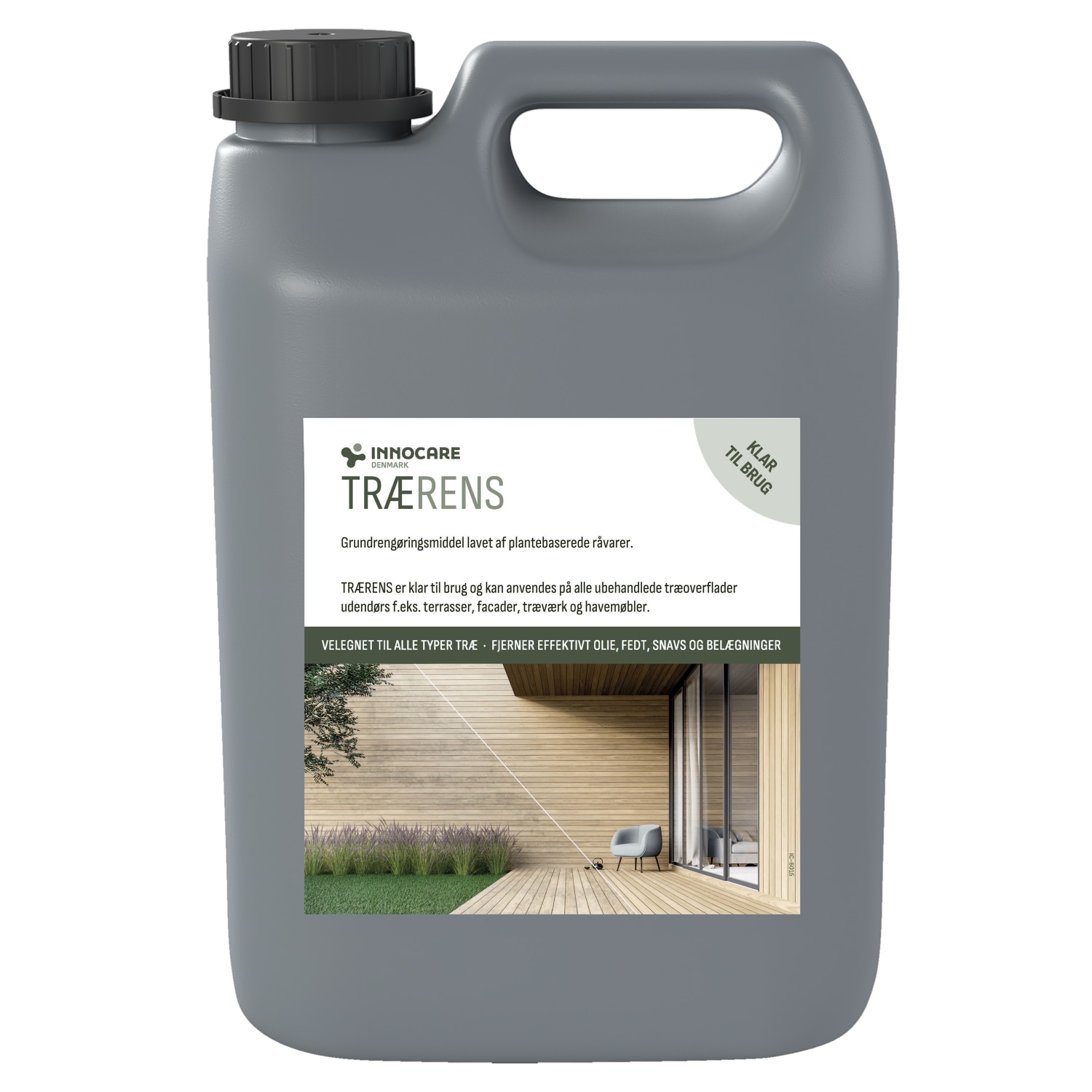 Effektiv og brugsklar trærens fra Innocare i en praktisk 5 liters beholder, ideel til grundig rengøring af træoverflader.