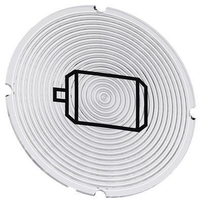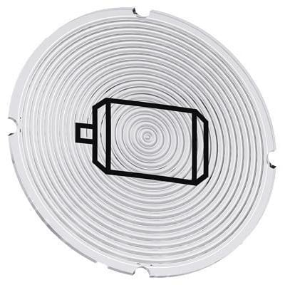 Inskription plade for lystrykknap, rund, hvid med sort font og grafisk symbol: horn.