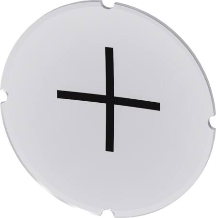 Inskription plade til trykknap, rund, hvid med sort font og grafisk symbol: Increase Plus.