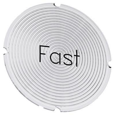 Inskription plade til trykknap, rund, hvid med sort skrift og teksten 'Fast'.