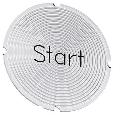 Inskriptionsplade til trykknap, rund, hvid med sort skrift og inskriptionen 'start'.
