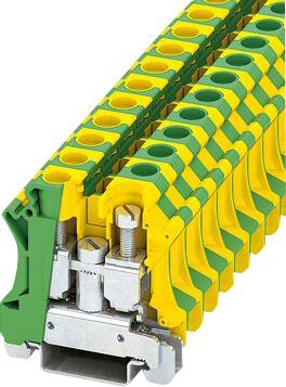 UTI 16-PE installationsjordklemme fra Phoenix Contact med skruetilslutning, tværsnit på 6 mm2 - 25 mm2 og grøn/gul farve.