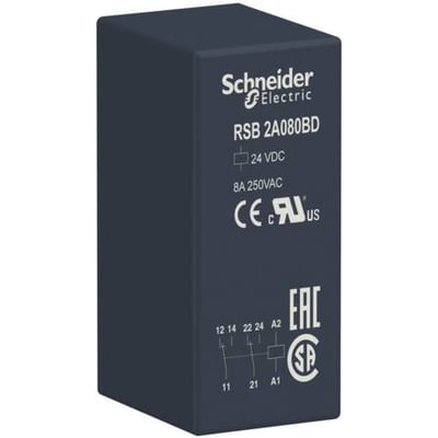Dette relæ fra Schneider Electric er en del af serierne RSB, RXM, RUM og RPM. Det er et plug-in relæ med kontaktmateriale af AgNi og en UN på 250/400 V DC/AC.