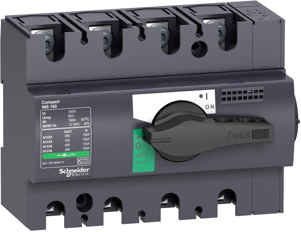 Compact INS125 lastadskiller fra Schneider Electric med 4 poler og 125A. Ideel til kontrol og afbrydelse af elektriske kredsløb i industri- og kontorbygninger.