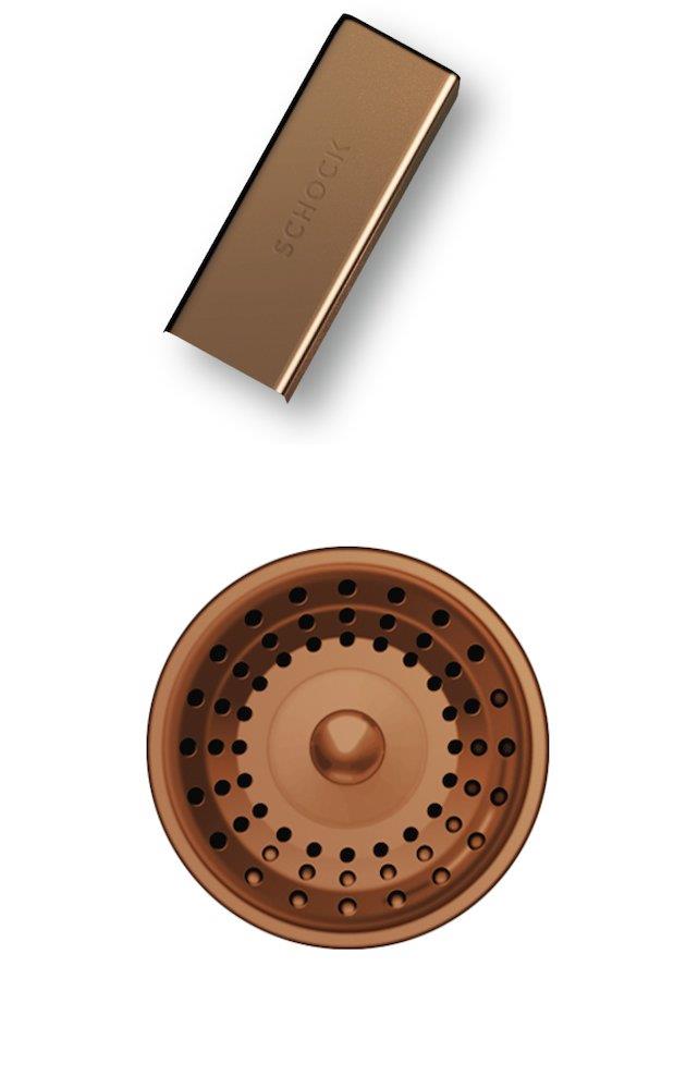 Kobberfarvet afløbsrist, overløbsrist og strainer til granitvask, der komplementerer dit køkken med et elegant touch.