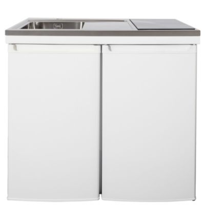 Køkkenet leveres med en hvidlakeret stålplade og en robust stålbordplade i rustfrit stål, som inkluderer en vask og vandlås. Vasken er placeret i venstre side og har et kummemål på 340x380x160 mm. Derudover er der en praktisk vådzone med plads til et skærebræt.