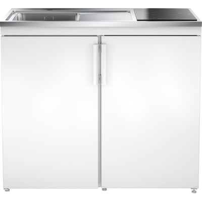 Køkkenet er udstyret med en induktionskogeplade og et integreret køle-fryseskab. Vasken er placeret til venstre og måler 340x380x180 mm, inklusiv strainer og vandlås.