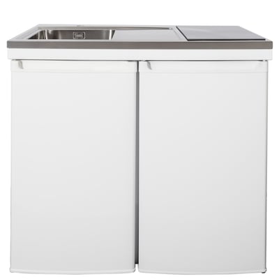 Minikøkkenet er udstyret med store kummer og en praktisk vådzone med plads til et skærebræt. Det leveres med et 50 cm køleskab og et 50 cm underskab i hvidlakeret stålplade.