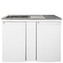Intra Juvel Culina minikøkkenet er en ideel løsning, når pladsen er trang, som for eksempel i en lille lejlighed, et sommerhus eller et kolonihavehus. Dette minikøkken kombinerer skandinavisk design med praktisk funktionalitet og leveres komplet med et 50 cm køleskab og et 50 cm underskab i hvidlakeret stålplade. Den robuste bordplade i rustfrit stål inkluderer en vask med vandlås, og vasken er placeret i venstre side.