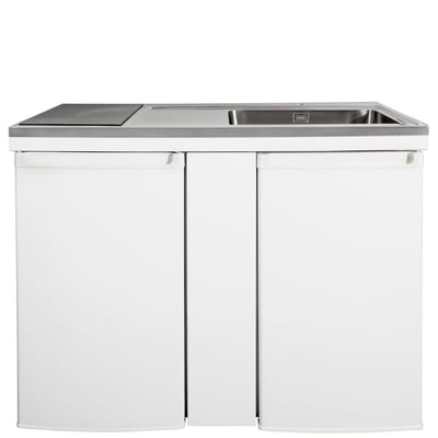 Minikøkkenet leveres med en holdbar stålbordplade i rustfrit stål, som inkluderer en rummelig vask med plads til et skærebræt i den praktiske vådzone. Vasken er placeret til højre. Desuden er der integreret en 50 cm bred induktionskogeplade og et 50 cm bredt køleskab med fryseboks.