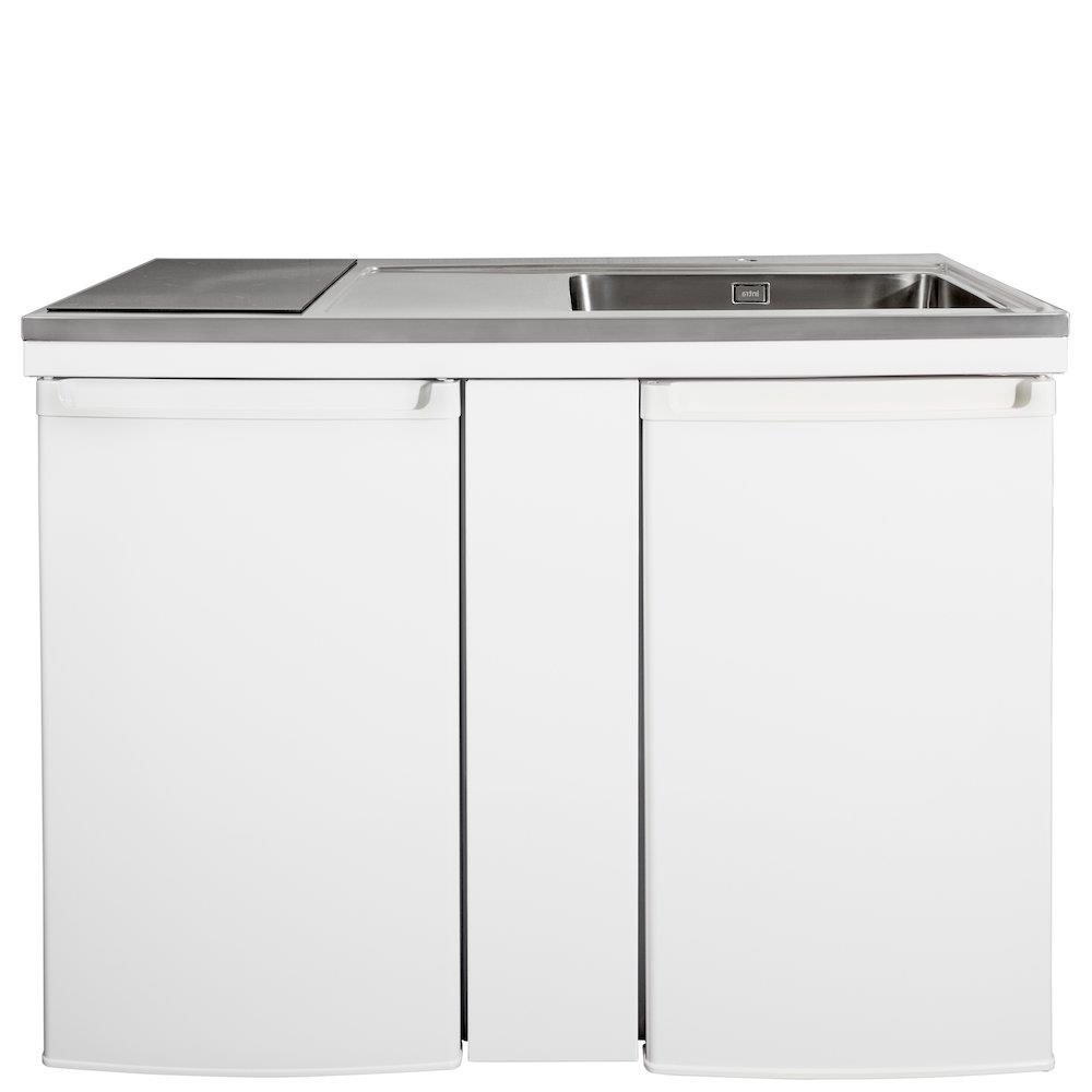 Culina minikøkken fra Intra Juvel. Kompakt og stilfuldt design med induktionskogeplade, køl/frys og rustfri stålbordplade med vask. Ideel til små rum.