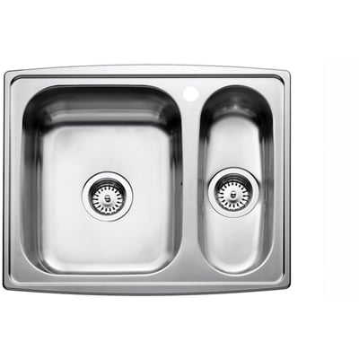 Køkkenvask i rustfrit stål til nedfældning med en stor og en lille kumme, hvor den store kumme er placeret til højre. Leveres komplet med strainer, overløb og vandlås.
