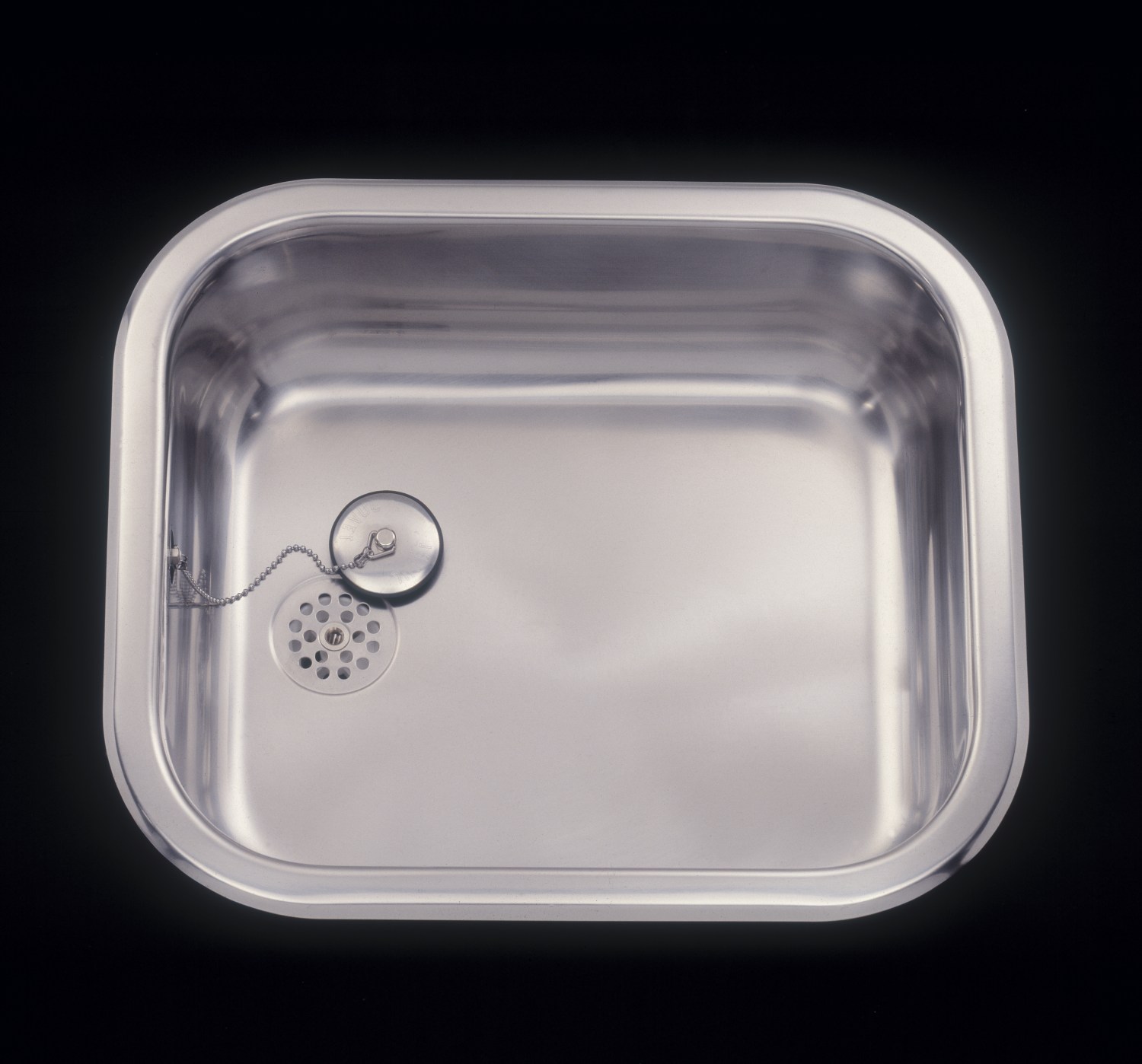 Elegant køkkenvask i rustfrit stål til underlimning. Inkluderer prop og overløb. Mål: 400x340x145 mm.