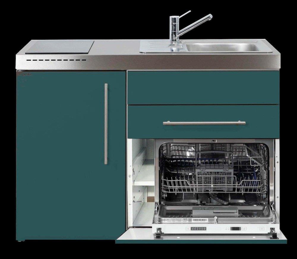 Kompakt minikøkken i Premiumline-serien med enkeltkumme, opvaskemaskine og keramisk kogeplade. Ideelt til mindre rum med sit lakeret stålkabinet.