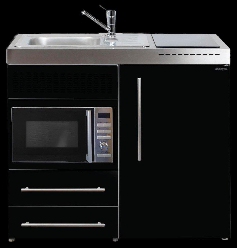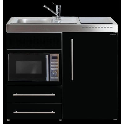 Minikøkken i Premiumline serien med sort enkeltkumme, vandlås, mikrobølgeovn og keramisk kogeplade. Komplet løsning til små rum.