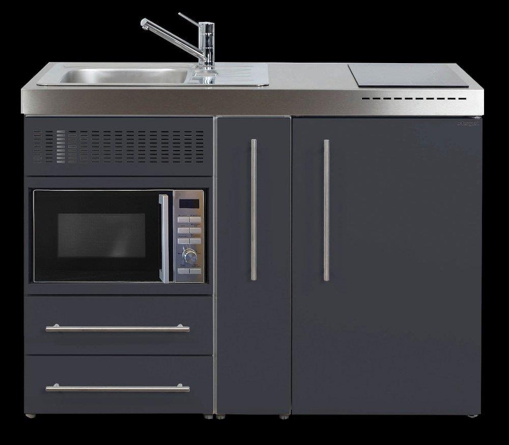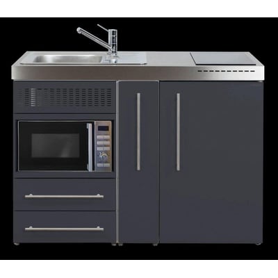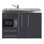 Kompakt minikøkken i grå, med enkeltkumme til venstre, mikrobølgeovn og keramisk kogeplade. Ideelt til mindre rum og med soft close skuffer.