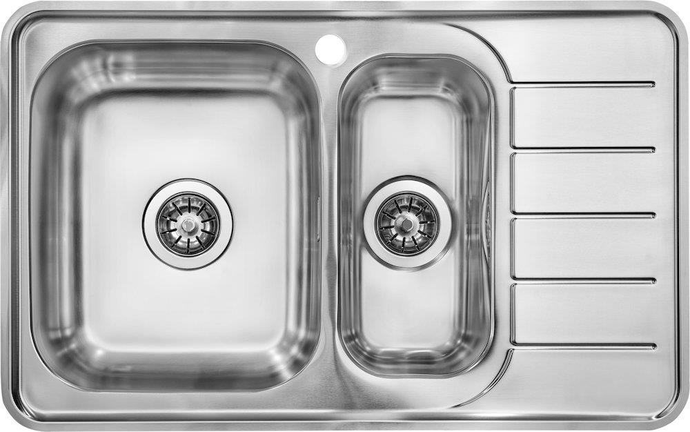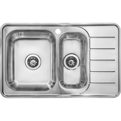 Intra Juvel Nivis køkkenvask med 1½ kumme og afløbsbakke. Fremstillet i poleret rustfrit stål med hanehul og manuel kurveventil. Kan monteres som nedfældning, planlimning eller underlimning.
