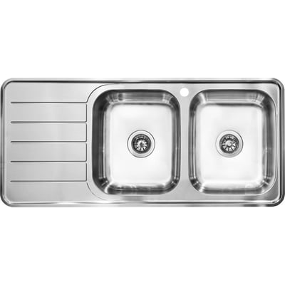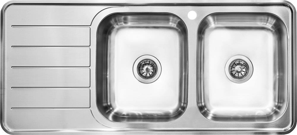 Intra Juvel Nivis er en dobbelt køkkenvask i poleret rustfrit stål med afløbsbakke, hanehul og manuel strainer. Kan monteres som nedfældning, underlimning eller planlimning.