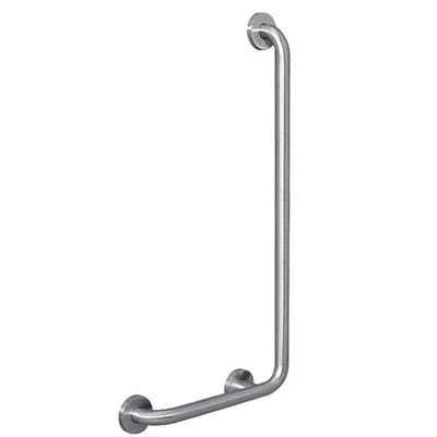 Venstrevendt støttehåndtag i børstet rustfrit stål (AISI 304) til vægmontering ved bruser og bad. Tåler op til 150 kg belastning, afhængigt af væg og montering.