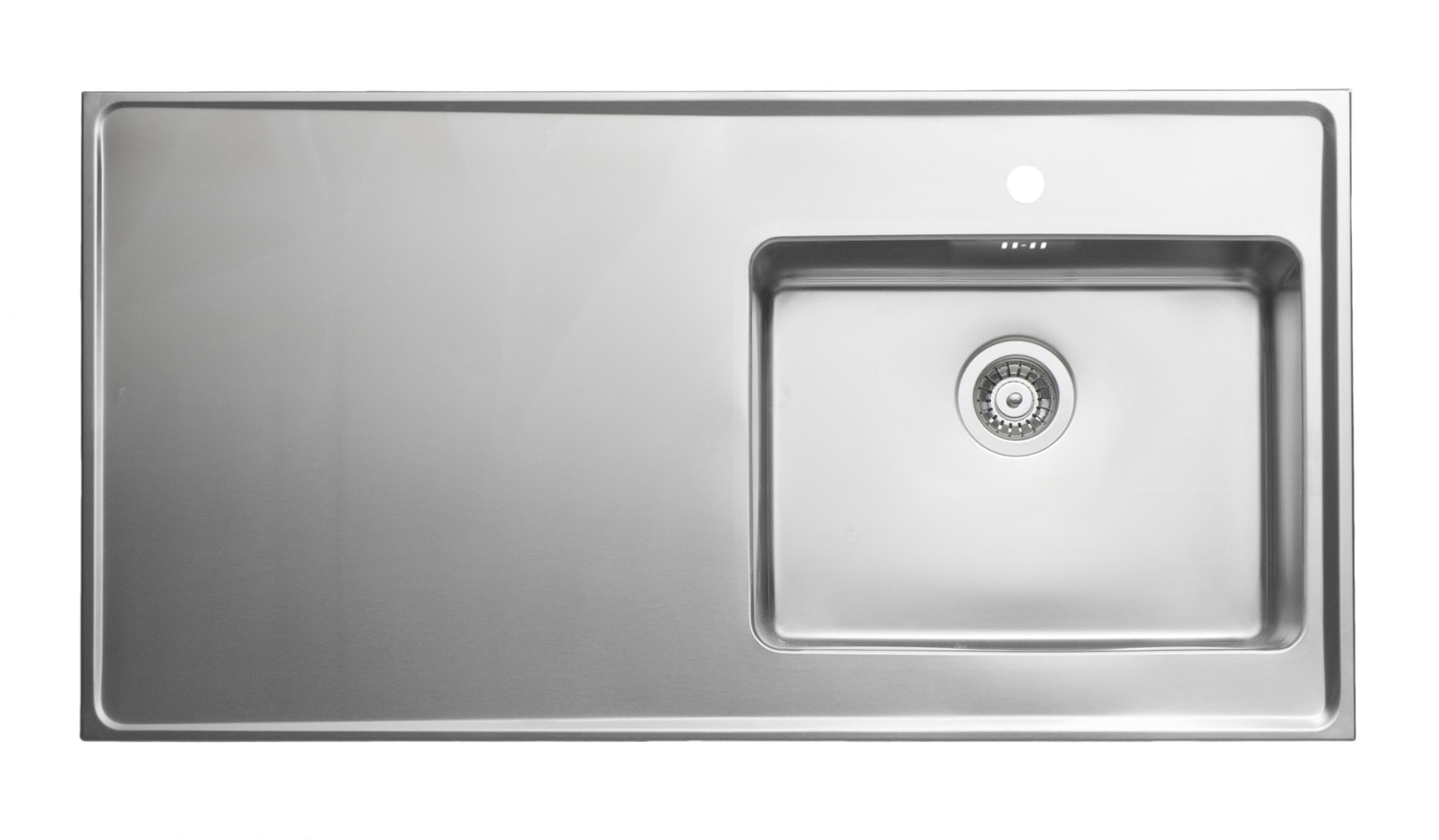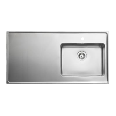 Moderne stålbord fra Intra Juvel QUBE med et stramt design og rene linjer. Bordet har en stor arbejdsplads og leveres med manuel strainer, overløb og vandlås. Perfekt til køkken eller bryggers.