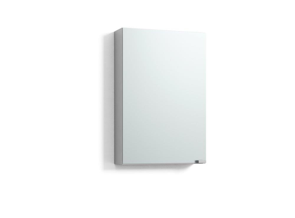 Intro spejlskab i hvid mat metal med to flytbare hylder. Kabinettet er IP44-certificeret og har miljøvenlig rustbeskyttelse. Mål: 45x70x15 cm.