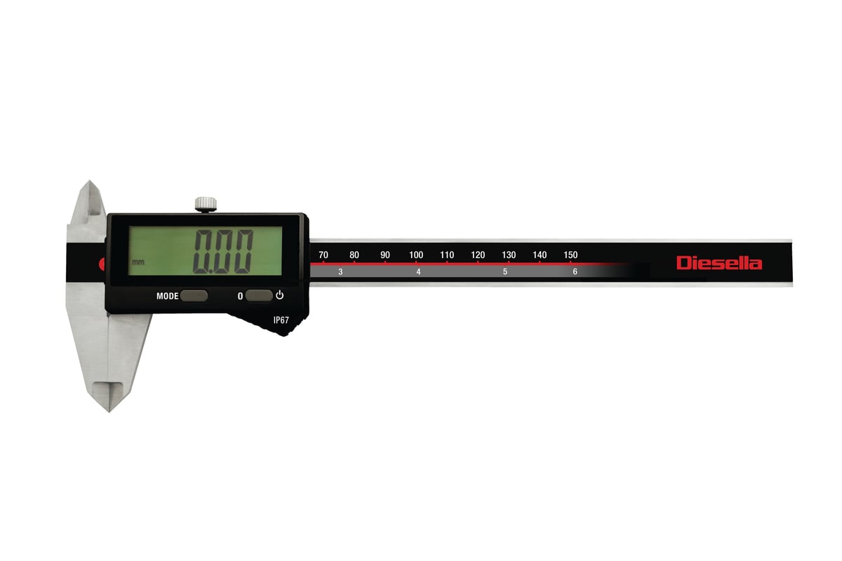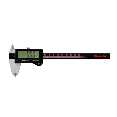 Digital skydelære fra Diesella, der måler fra 0-150 mm med 0,01 mm aflæsning og kæbelængde på 40 mm. Vand- og støvtæt (IP67) og kølemiddelsikker.