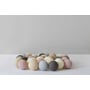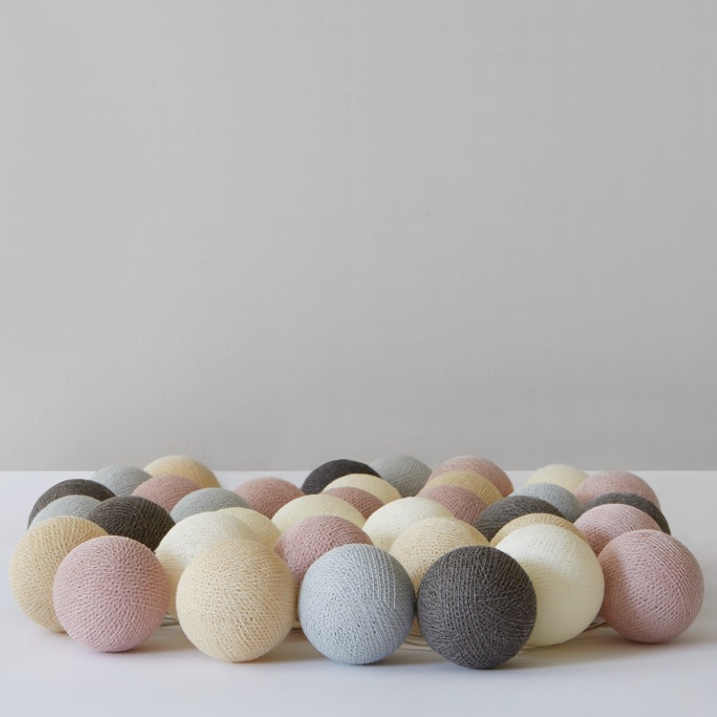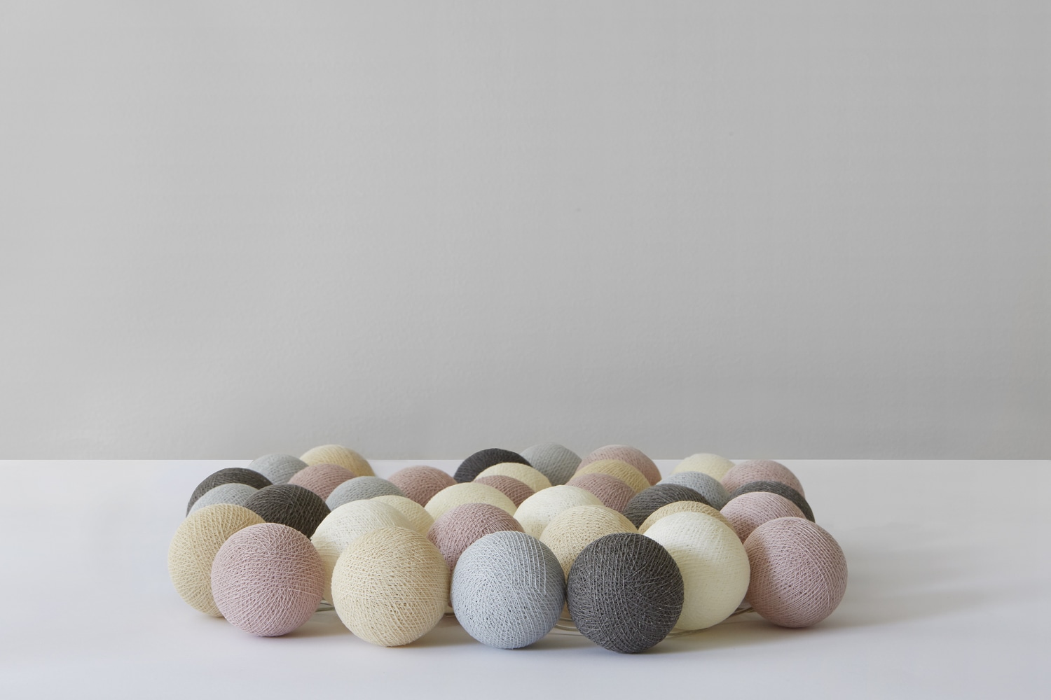 IrisLights lyskæde med farvede kugler i grå nuancer, creme og støvet lyserød. 20 LED dioder, 2700K, 3.4W. Til indendørs brug.