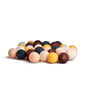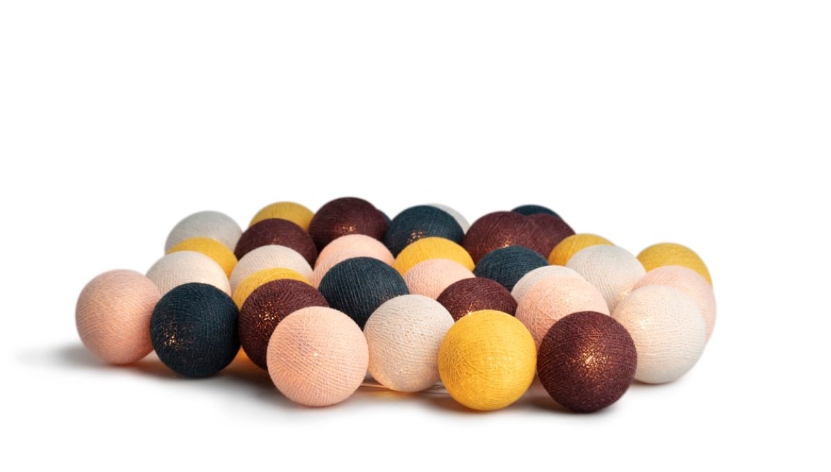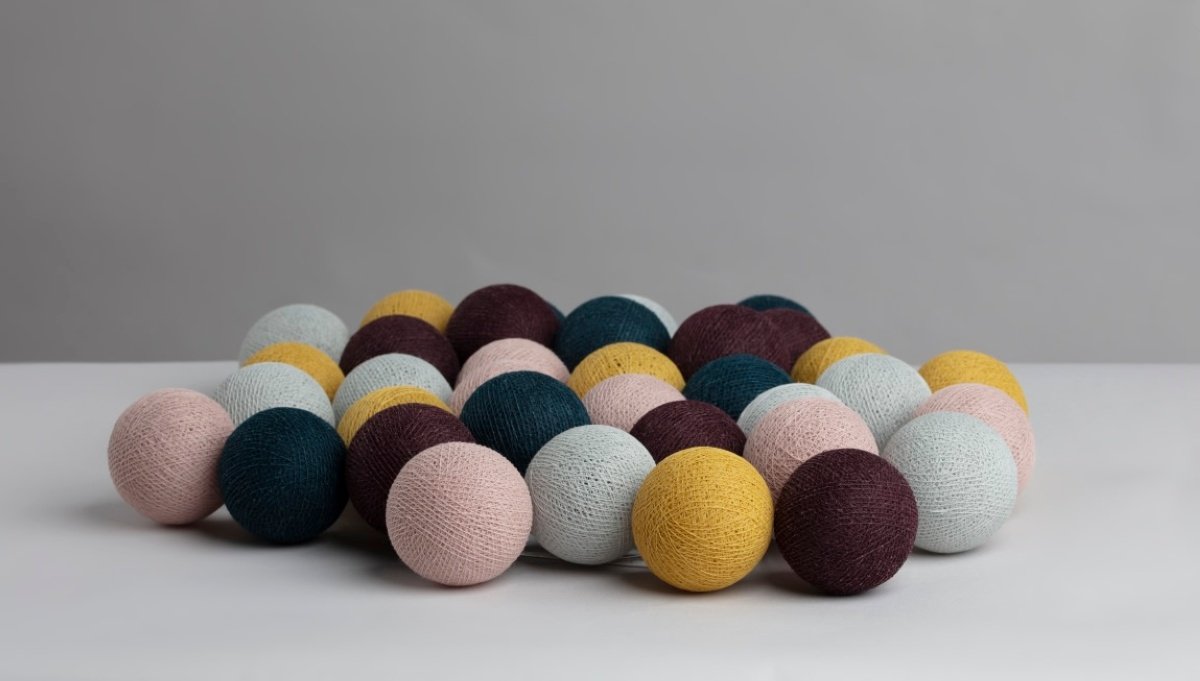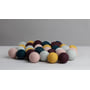Lyskæde med inspiration fra Nyhavns farver: petrol, aubergine, sennep, sart lyserød og lysegrå. Boldene er placeret parvis med 14 cm afstand. Perfekt til indendørs brug.
