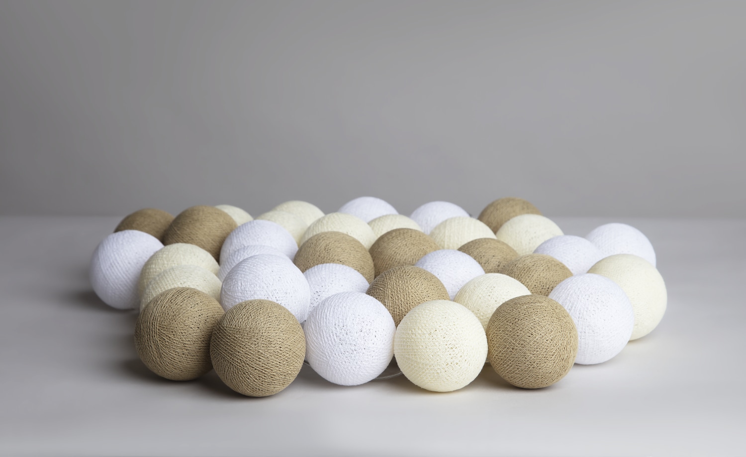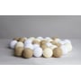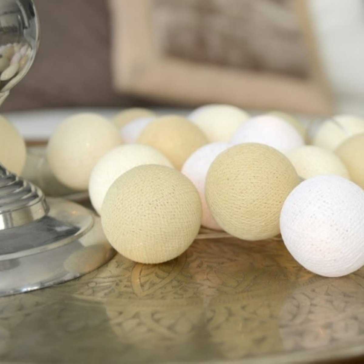 Lyskæde med 20 LED lys i sandfarvede kugler. Giver et behageligt lys og er velegnet til indendørs brug. Med klar ledning og afbryder.