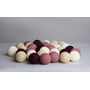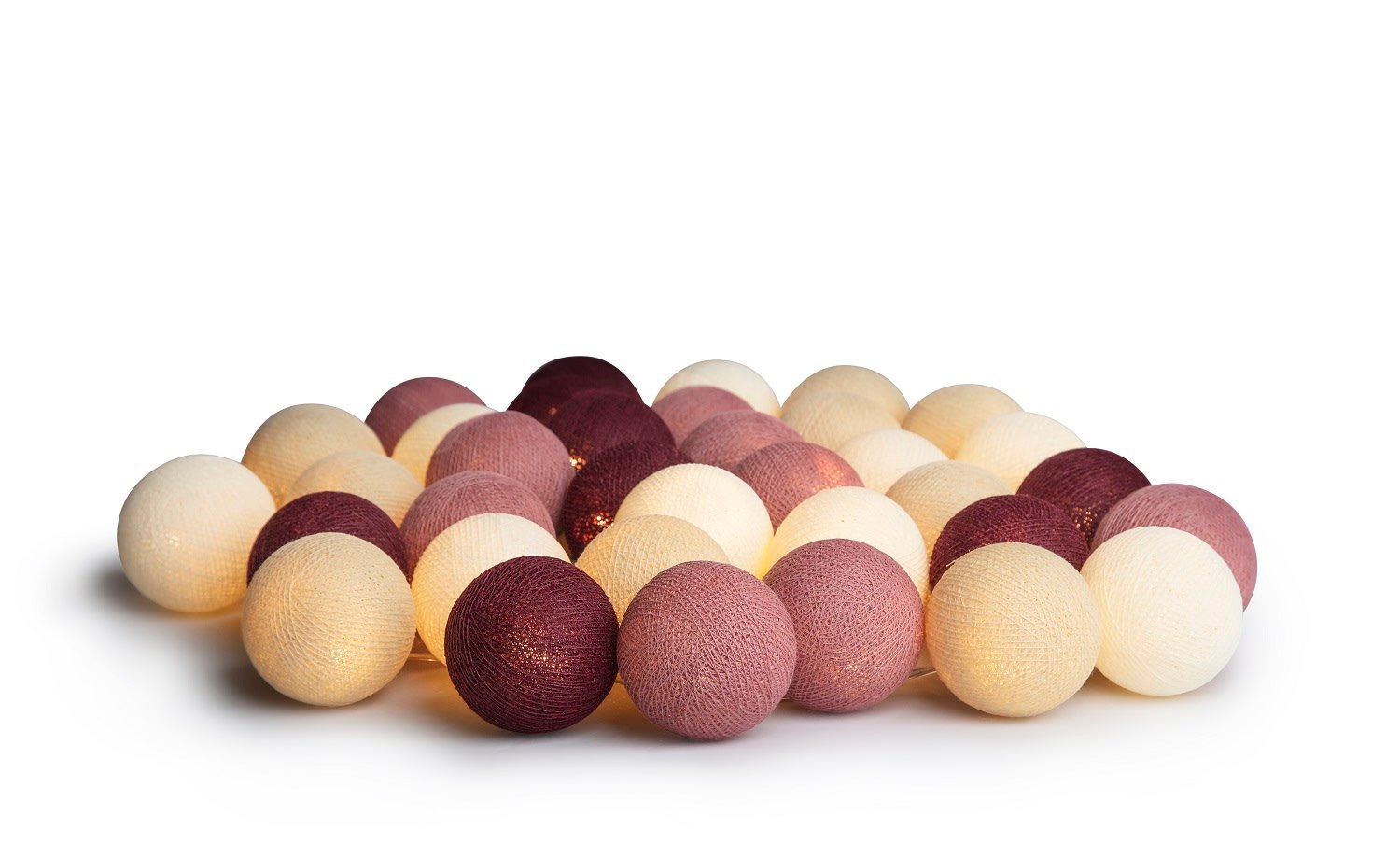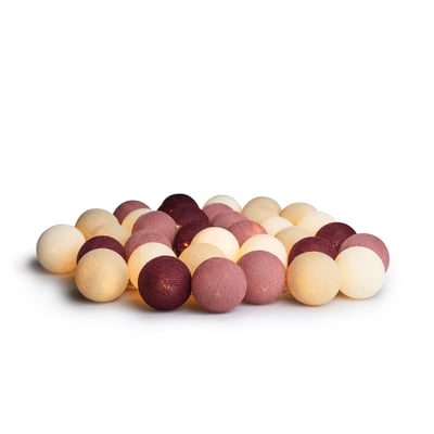 Lyskæde fra IrisLights med kugler i støvede hvide, lyserøde og bordeaux nuancer. Med 35 LED lyskilder og en totallængde på 390 cm.