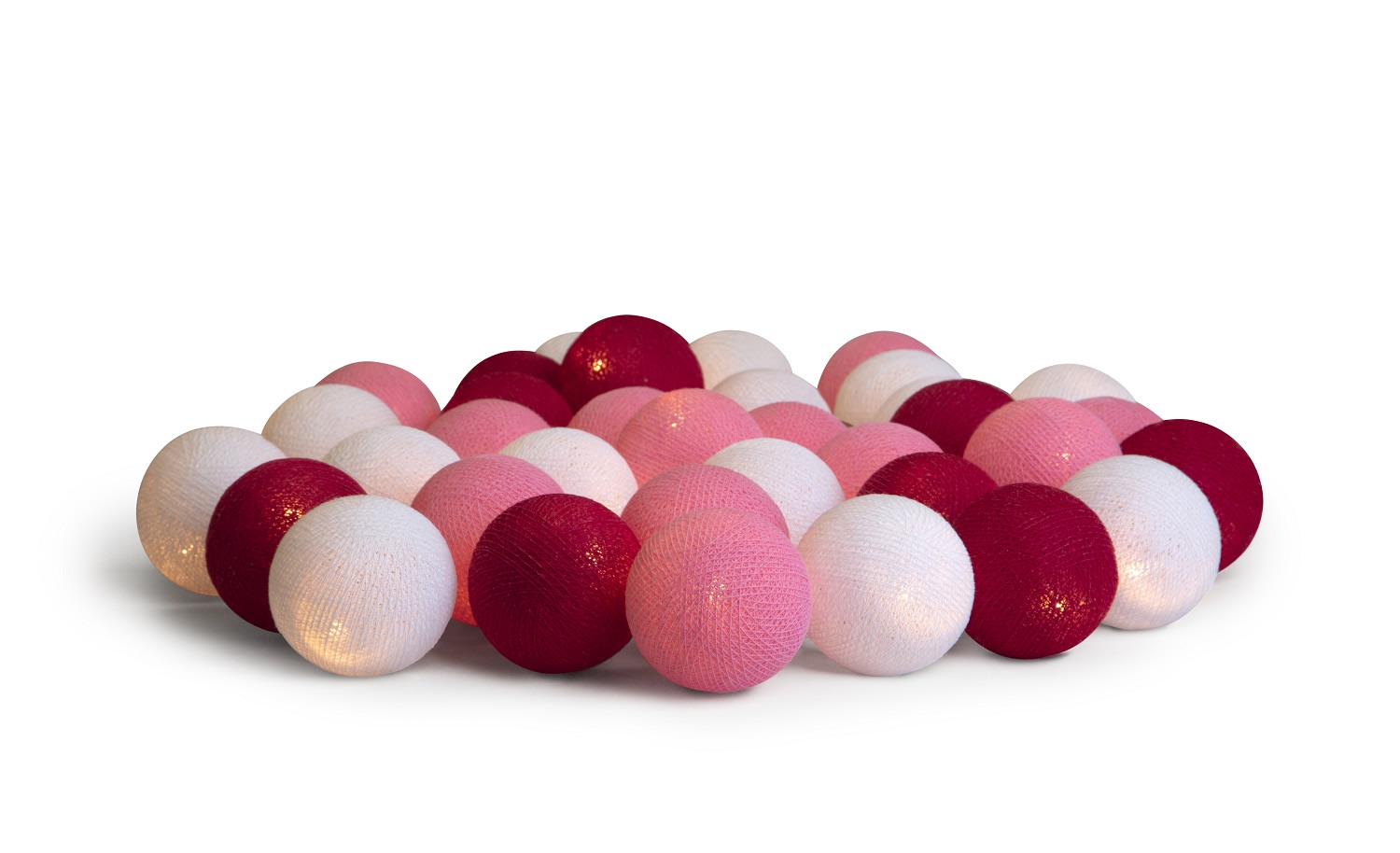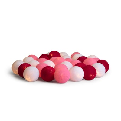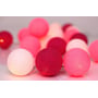 Lyskæde med flotte stofkugler i grå, hvide og lyserøde nuancer. Lyskæden har et støvet pastel farvetema og 20 LED lyskilder. Kuglerne er placeret parvis med 14 cm afstand.