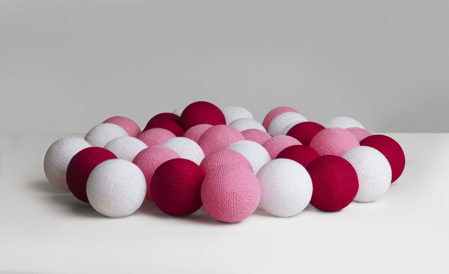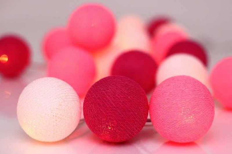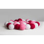 Lyskæde med flotte kugler i grå, hvide og lyserøde nuancer. Med støvede pastelfarver. Boldene sidder 2 og 2 med 14 cm imellem.