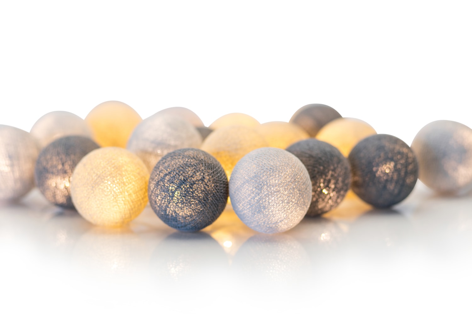 Lyskæde med farvede kugler i grå nuancer blandet med creme. LED lyskilde, 2700K, 3.4W, 230V, IP20. Til indendørs brug.