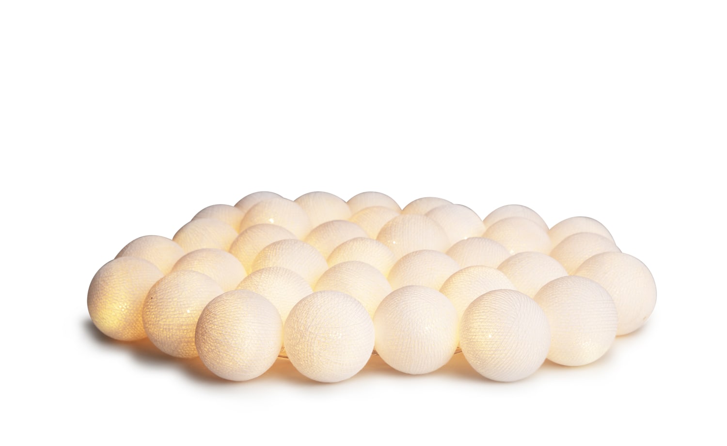 Helt hvide LED kugler på snor, som snebolde på en vinterdag. Lyskæden har et smukt hvidt lys. Kuglerne sidder parvis med 14 cm afstand.