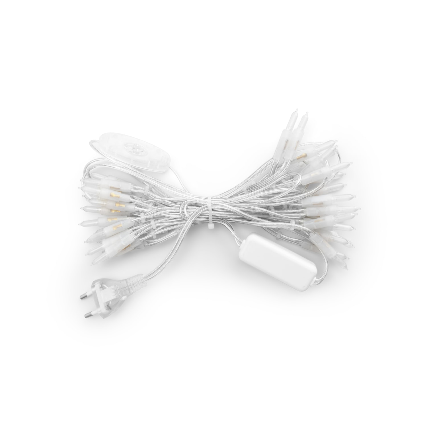 IrisLights lyskæden med 35 indbyggede LED-lys er designet til at skabe en hyggelig og stemningsfuld atmosfære i ethvert indendørs rum. Lyskæden er udstyret med en klar ledning, der diskret falder ind i omgivelserne, og den leverer et behageligt varmhvidt lys på 2700 Kelvin.