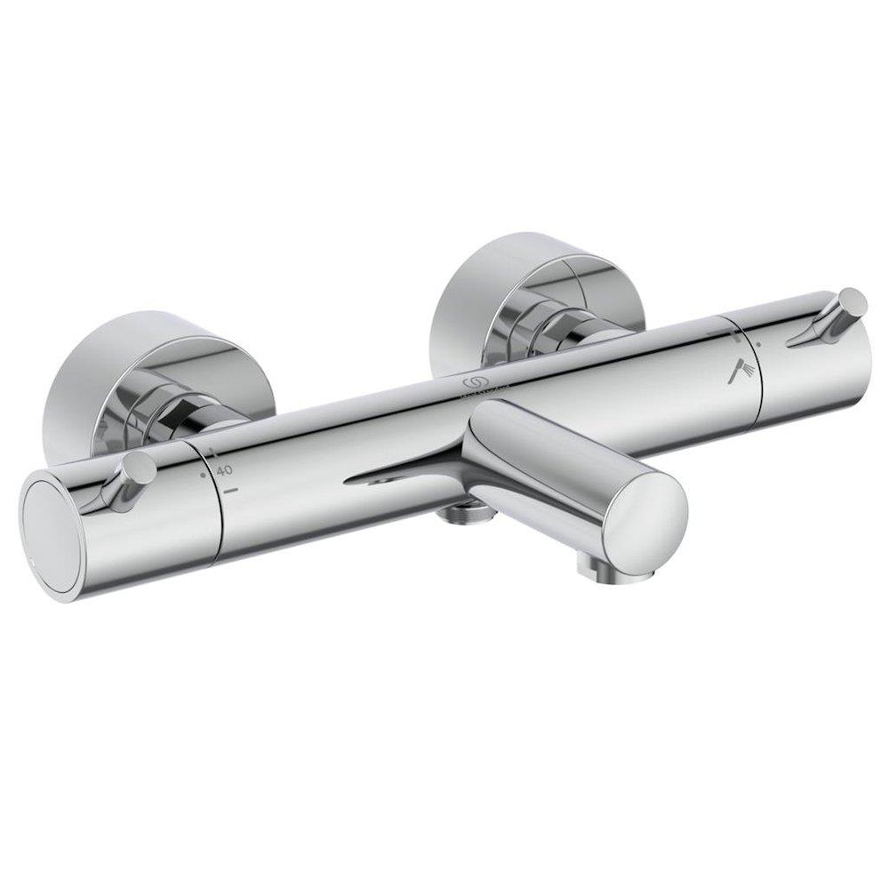 Ideal Standard Ceratherm T125 kar/brusetermostat i krom med keramisk 2-vejs ventiloverdel, skoldningsspærre og vandsparer. Med S-forskruninger og rosetter.