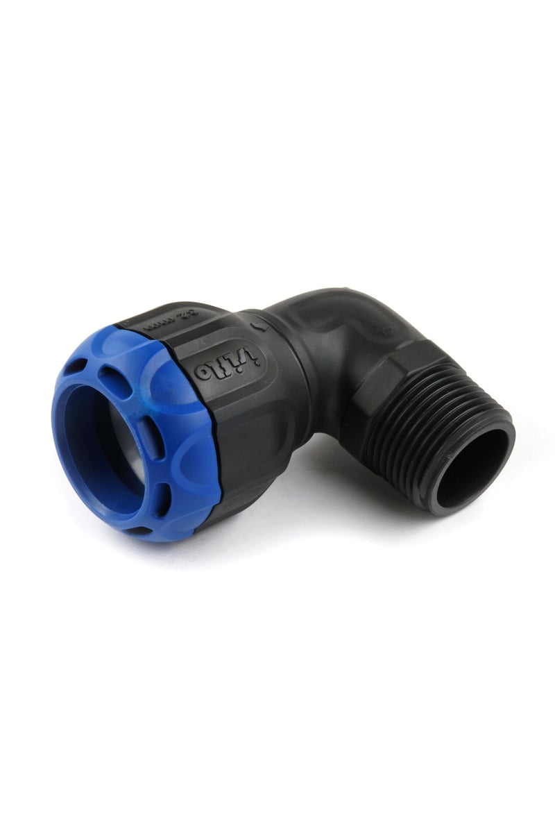 En 90° vinkelkobling med nippel i kompositmateriale. PN16, VA-godkendt og nem at montere uden specialværktøj.