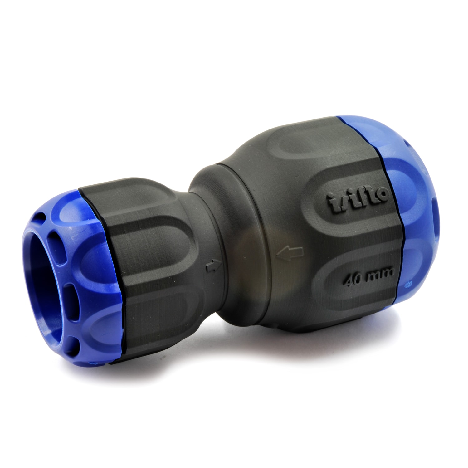 Reduceret samlemuffe i kompositmateriale med Push-in kobling. Nem og hurtig montering uden værktøj. Godkendt til drikkevand.