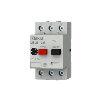 Motorværn MS25 med indstillingsområde 1,6 - 2,5A. Beskytter mod overbelastning og kortslutning.