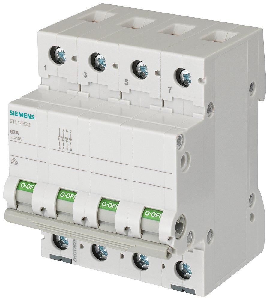 4-polet afbryder fra Siemens til montering på DIN-skinner. Bruges til styring af el-anlæg, belysning, motorer og andre elektriske enheder. Mærkestrøm: 63A.