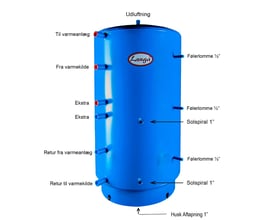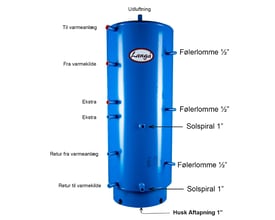 Isoleret akkumuleringstank med solspiral. Volumen: 3000L. Maks temperatur: 95°C. Maks tryk: 3 bar.