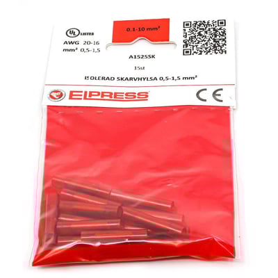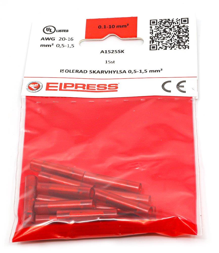 Isoleret samlemuffe A1525SK til 0,5-1,5mm² Cu-leder. Materiale: Cu 99,95%, fortinnet, plast PC. Isolationsfarve: Rød. Leveres i poser á 15 stk.