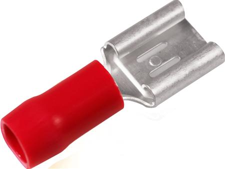 Isoleret spademuffe A1507FLS til 0,5-1,5mm² Cu-leder og 6,3x0,8 spadestik. Materiale: Messing/Cu, Cu/Sn, plast PC. Isoleringfarve: Rød. Leveres i poser med 10 stk.